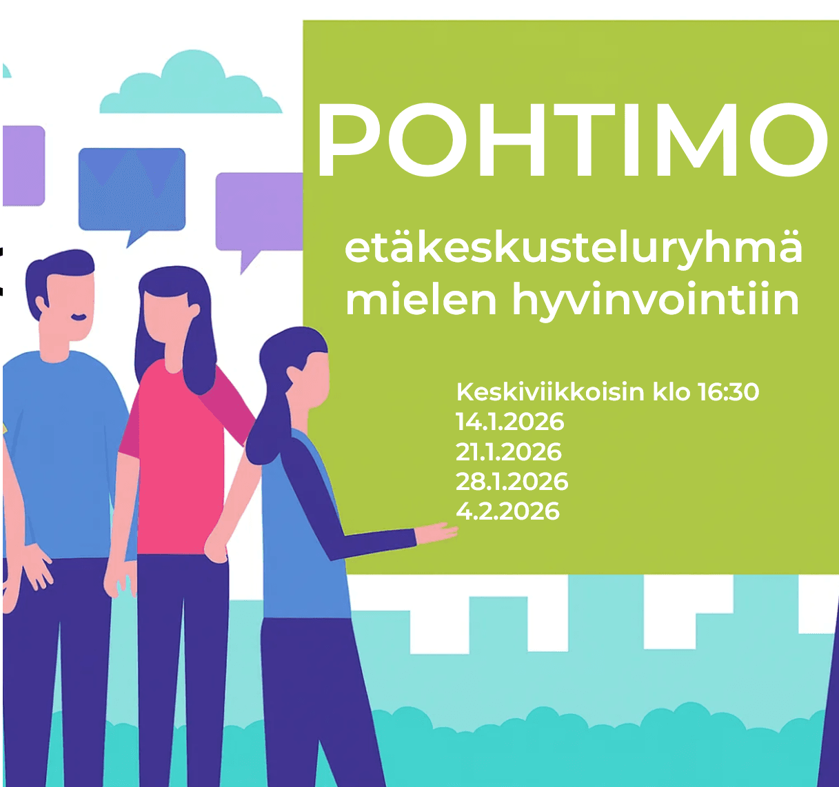 Pohtimo on Mielihyvin Savosta ry:n järjestämä maksuton etäkeskusteluryhmä täysi-ikäisille, joita kiinnostaa oman mielen hyvinvoinnin vahvistaminen arjessa. Ryhmään osallistuminen on helppoa: liityt mukaan nimimerkillä tai etunimellä suoraan selaimesta – ilman sovellusten lataamista ja täysin omassa rauhassasi.